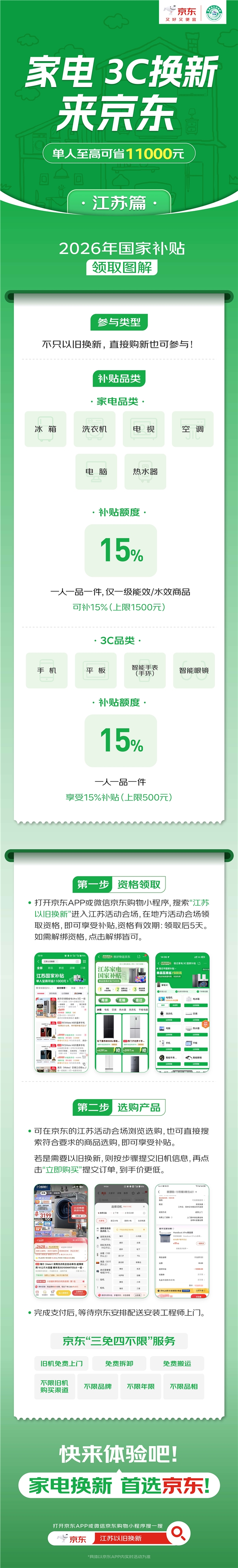 1月1日,2026年国家以旧换新补贴落地江苏,京东线上线下全面承接国家补贴落地。江苏消费者到京东APP搜索“江苏以旧换新”即可进入国补页面,领取国补资格。上京东,消费者购买活动指定的冰箱、洗衣机、电视、空调、电脑、热水器产品,单件/单次至高补贴1500元;购买活动指定的手机、平板、智能手表手环、智能眼镜产品,单件/单次至高补贴500元。单人累计至高可省11000元!此外,京东也带来海量爆款好物,1月1日起,上京东领国补,买手机、电脑、家电等好物低至五折!